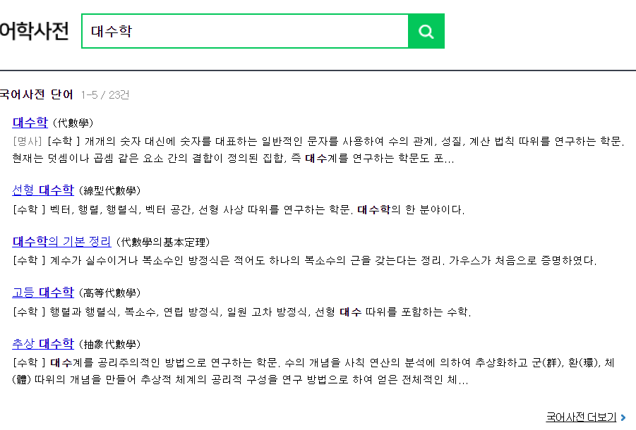 [초록창 어학사전에서 검색한 대수학의 결과이다. 대수학의 대 자가 대신할 대 자인 것이 눈에 들어온다. 물론, 선형 대수학 아래의 것들은 필요하지 않은 이상 볼 일이 있을까 싶지만... 적어도 어떻게 설명하는지 들어보지도 않고 도망치진 않을 것 같다.]