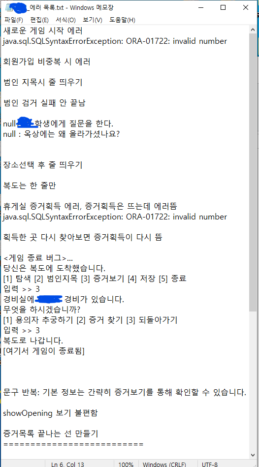 그리고 가장 스트레스 받은 부분은 취합 및 에러 수정하기 이다. 취합하면 취합해서 수정하고 맞추고, 프로그램을 돌려보면 어김없이 수정할 곳이 눈에 들어온다. 아래와 같은 에러 목록 만들고 해결하면서 하나씩 지우는 작업 만 5명이서 세 번은 더 한 것 같다... 특히 다른 팀에게 배포하기 위해 .exe 파일로 만들면 또 원하지 않는 형태로 나와서 수정하기도 했다.