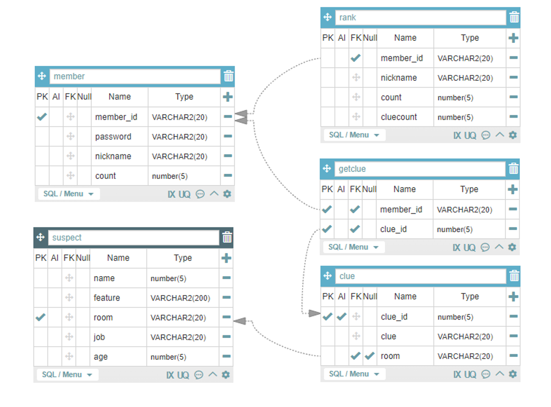프로젝트 준비라고 할 것은 상기 문서만 해도 대강의 감은 잡고 진행할 수 있다. 하지만 협업의 과정에서 이것저것 도움을 줄 수 있는 수많은 툴(tool) 도구들이 세상에 만들어져있고, 수많은 문서의 존재가 증명하듯 프로젝트 진행에 도움이 될 준비 과정도 많다. 그래서 우리팀은 추가적으로 ER-Diagram 작성 툴로 Aquery, 공유 저장소로 github를 협업 툴로 사용했고, 추리소설 스토리를 위한 컨셉 정리 문서, 변수명, 함수명 문서 등을 만들었다. 비록 완벽하게 형식을 갖춰서 만든 것은 아니지만 최소한의 내용 공유와 혼선을 막기 위한 장치였다.