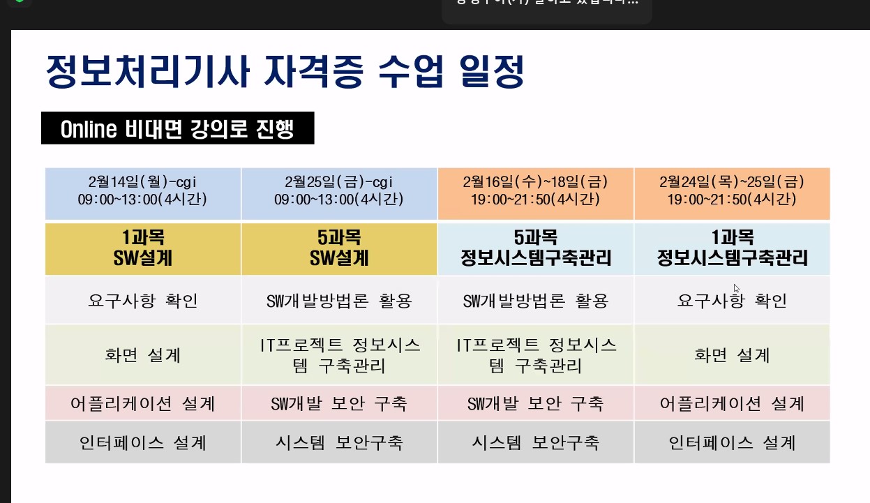 스마트인재개발원의 국비지원 개발자과정 수업에는 정보처리기사 자격증 일정이 포함되어 있다. 자격증 일정에 맞추어서 수업 일정 중간에 정보처리기사 자격증 수업 일정을 짜놓는 것 같다. 이번 3월 5일 시험과 관련해서도 14일부터 2주간 오전 4시간씩 수업을 진행했다.
