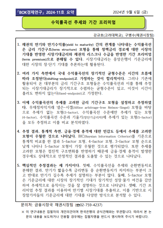 [제2024-11호] 수익률곡선 추세와 기간 프리미엄 | BOK 경제연구(상세) | 연구자료 | 한국은행 경제